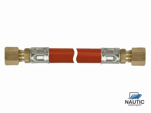 Gummigasschlauch mit Messingnippeln und Edelstahl-Klemmrohren.