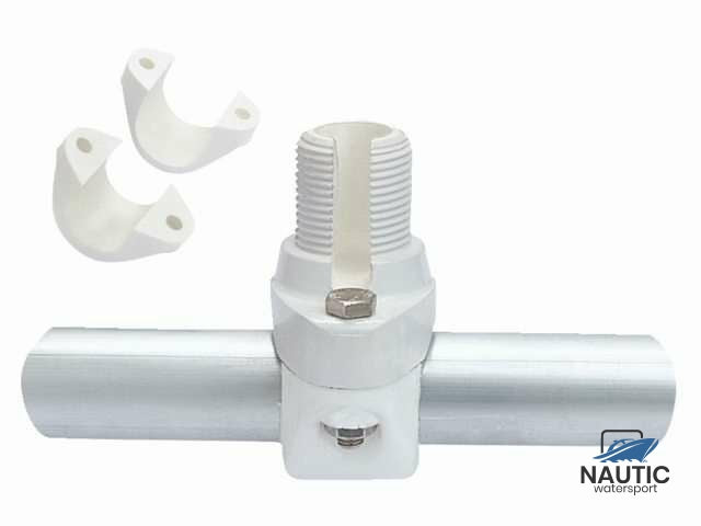 Railing mounting bracket made of reinforced plastic and UV-resistant, for installing GPS antennas on horizontal railings. Comes with clamps for three different rail diameters: 22mm, 25mm, and 30mm.